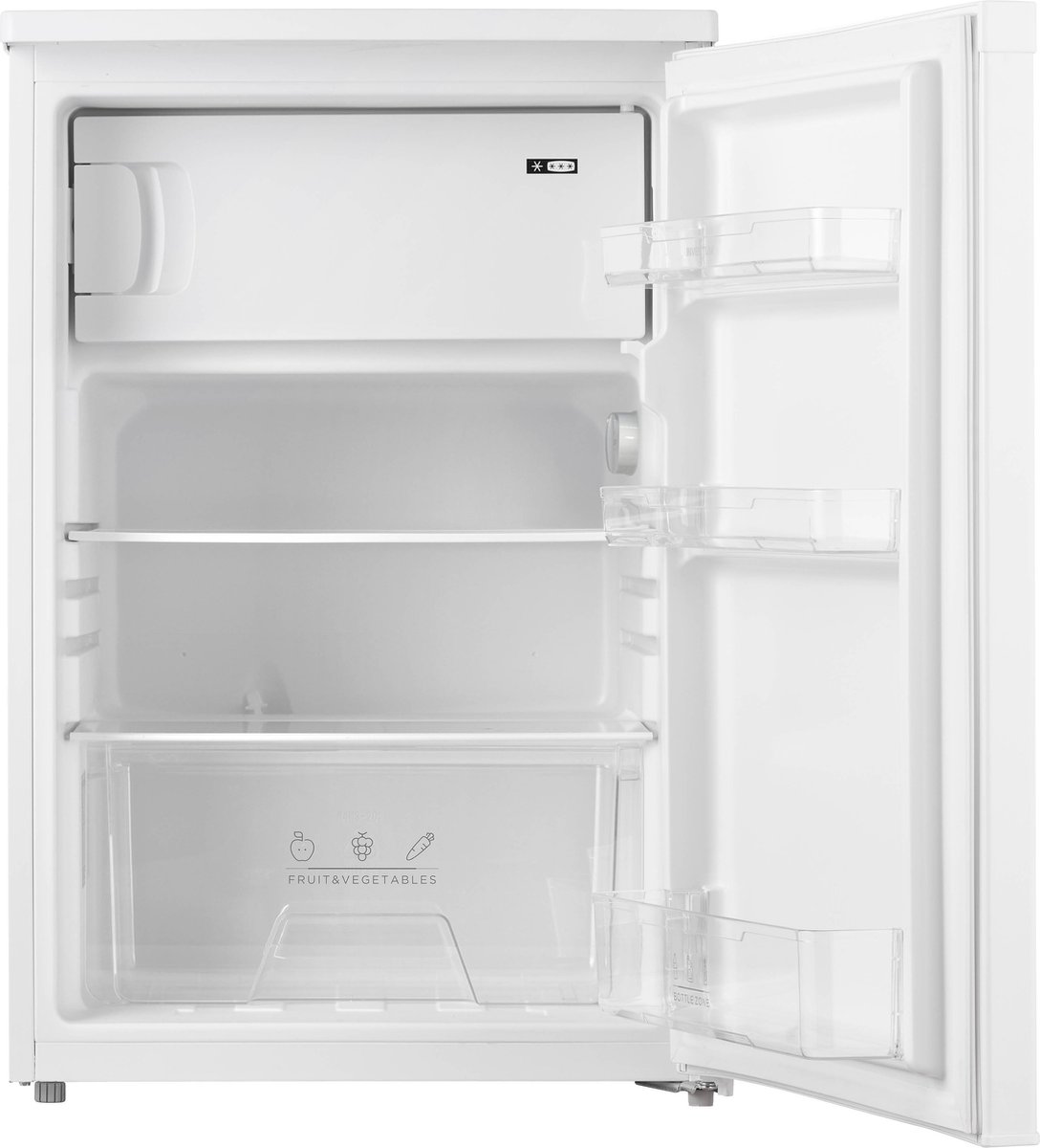 De Inventum vrijstaande koelkast KV550 met vriesgedeelte heeft een totale netto inhoud van 113 liter. Het is een zuinige koelkast met energieklasse E. Het 4 sterren vriesgedeelte met een netto inhoud van 16 liter, heeft een invriesvermogen van 2 kg/24u. De koelkast heeft twee draagplateaus en onderin een transparante groentelade. Met twee deurvakken, een flesvak en een eierrekje berg je al je etenswaren netjes op. Deze onderdelen zijn eenvoudig te verwijderen, zodat je deze goed kunt schoonmaken.
